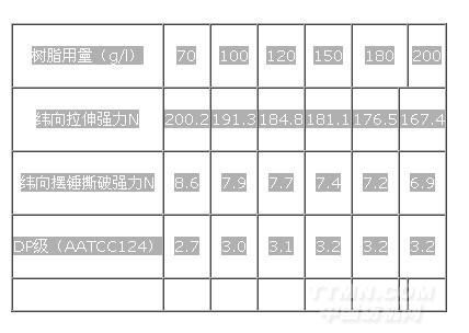 由上表可知,随着树脂用量的提高,DP逐渐提高,但强力逐渐下降,用量在150g/l,再提高树脂用量,DP级不再提高,因此,树脂用量选为150g/l左右。