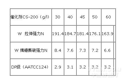 由上表可知,增加催化剂用量,DP级逐渐提高,但是强力也明显下降,当催化剂用量是树脂用量的30%左右时(即上表40~50g/l),综合DP级与强力最好。