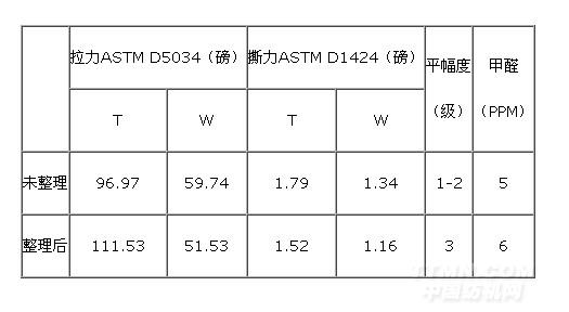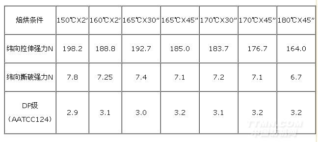由上表数据可知,在温度160℃-170℃,焙烘时间45秒时,可达到较好的平服度,再提高温度,平服度增加不明显,强力损失较大。最佳的温度与时间为165~170℃45秒。