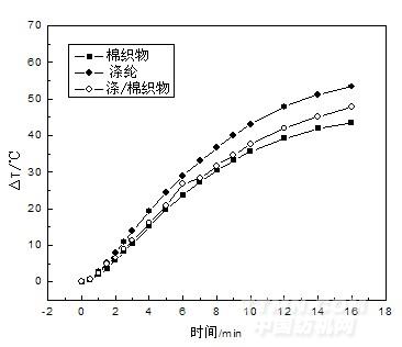 在制备隔热涂层织物时,基布材料对其隔热性能的影响是不容忽视的。纤维材料、组织规格、厚度等不同,所制得的涂层织物的隔热性能也是千差万别的。图4为分别以棉织物、涤纶织物和涤/棉织物作为基布材料时,所制得的涂层织物的隔热性能。