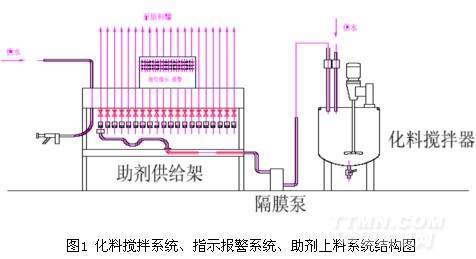 将高浓度或粉末状染料或助剂与水按一定比例混合,搅拌,使其配置或稀释成生产用染料或助剂,如图1所示。
