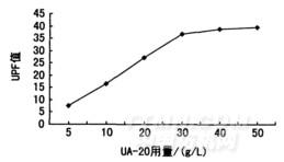 染料对光的吸收具有选择性。一部分染料对光的吸收可延伸到紫外线波长范围内,从而可提高织物的紫外线防护性能。为避免染料种类对测试结果产生影响,试验采用白色面料。取不同用量防紫外线整理剂UA-20,采用增白棉织物按1.3.1节工艺进行整理,结果见图1。