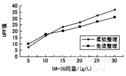 本试验在棉织物柔软整理和免烫整理浴中加入高分子防紫外线整理剂UA-20,对织物进行一浴整理,并探讨整理剂用量、加工方式和荧光增白剂等因素对防紫外整理效果的影响。UA-20可在织物表面形成柔软皮膜,与纤维的黏合性良好,耐水洗性能优异。