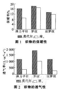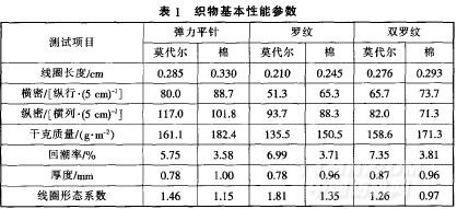 从表l数据可以看出.由于莫代尔针织物的线圈长度比棉织物小.因此克质量、厚度也均比棉织物小。