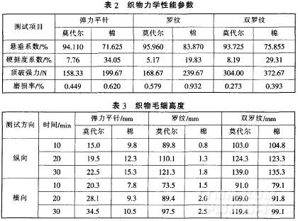 从测试数据得知.相同条件下.莫代尔针织物的磨损率小于棉针织物.即莫代尔针织物的耐磨性好于棉针织物这是由于莫代尔纤维的强度和断裂伸长率都比棉纤维大.且莫代尔纱线的表面毛羽少.比较光滑.使织成的织物的表面毛羽也相应较少。摩擦系数小。