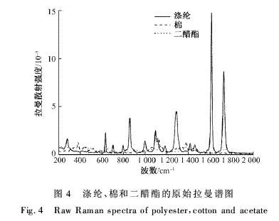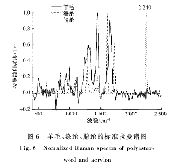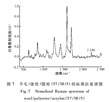 对于多组分混纺样品,光谱特征峰强度大的组分将一定程度地淹没强度小组分的特征峰,即使是最高峰也不例外。被淹没的最高峰虽然还存在,但是其强度 往往和其他组分的较小峰甚至与检测噪声在同一个数量级。多组分纤维混纺样品和单组分纤维及其自身的标准拉曼谱图见图6、7。