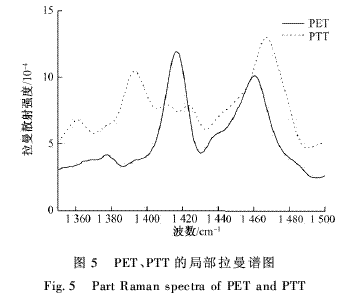 用拉曼光谱可以区分具有相同官能团但碳链稍有区别的同类纤维。例如聚酯中的PET与PTT,其局部拉曼谱图如图5所示。PET与PTT的结构单元 只相差1个碳原子,在拉曼谱图中的差异是PET在1 390 cm-1处有1个峰,而PTT在1 420 cm-1处有1个峰,其余位置2个谱图大致相 同,这在分辨率为6个波数的拉曼光谱图中已有明显的区分。