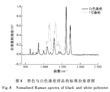 测试样品分为2组:一组为涤纶五枚缎,颜色为黄、银灰、紫、玫红、大红,共5份;另一组为涤纶桃皮绒,颜色为黑、湖蓝、绿,共3份。均有信噪比良好的谱图,并与白色涤纶的谱图进行对比。其中7号黑色涤纶的谱图与白色涤纶谱图不同,如图8所示。
