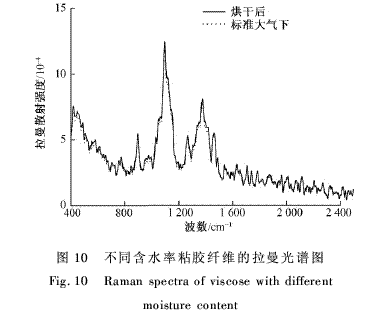 图10为不同含水率粘胶纤维的拉曼光谱图。可以看出,烘干后粘胶纤维的拉曼谱图与标准大气下接近重叠,无法区分。这说明水分对粘胶纤维的拉曼光谱没有影响,样品可不经干燥直接进行检测。