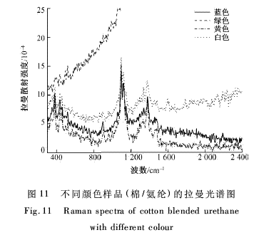 测试样品为4种不同颜色的棉/氨纶(97/3)织物。绿色样品没有测到信噪比高的拉曼谱图,且有轻微灼烧的现象。拉曼谱图如图11所示。