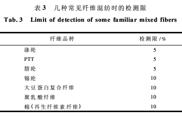 通过拉曼光谱定性检测多组分混纺纤维,结果显示:一方面低含量组分的特征峰会被高含量组分的特征峰所淹没,尤其是光谱强度较低的纤维更明显;另一 方面,光谱特征峰强度大的组分将一定程度地淹没强度小的组分特征峰,即使是最高峰也不例外。被淹没的最高峰虽然还存在,但是其强度往往和其他组分的较小峰 甚至与检测噪声在同一个数量级。综合考虑得到几种常见纤维混纺时的检测限,结果见表3。