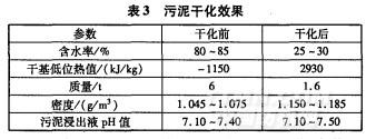 目前该企业建成了处理量为6t/d的污泥干化减量工程,湿污泥压滤后含水率约80%,经干燥处理后含水率低于30%,减重70%以上。污泥干化效果见表3。