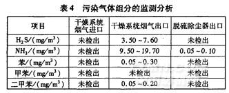 由图5可知,污泥干化系统稳定运行一周内,系统烟气出口NOx无明显变化,而烟气出口SO2浓度较进口有所减少,均值从475mg/m3降到420mg/m3,脱硫率为l1.6%,具有一定的脱硫效果。这是因为物化反应单元采用石灰作为混凝药剂,在干燥过程中与烟气中SO2反应生成CaSO4脱除了烟气中部分SO2污泥干燥系统连续稳定运行两个月内,周期性地对干燥系统烟气进口、烟气出口和脱硫除尘出口的几种典型污染气体组分进行监测,结果见表4。