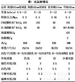 无锡市的色织厂引进了该机,从Dansk公司提供的400多个样布看,无论在品质或图案质量上,均达到国际一流水平。按照正常工艺要求在20℃以上的室温下进行转移印花,并在40℃以上的温湿状态堆置。该厂试生产是在0℃左右进行的,在一定程度上影响了产品质量效果。试品种情况见表1