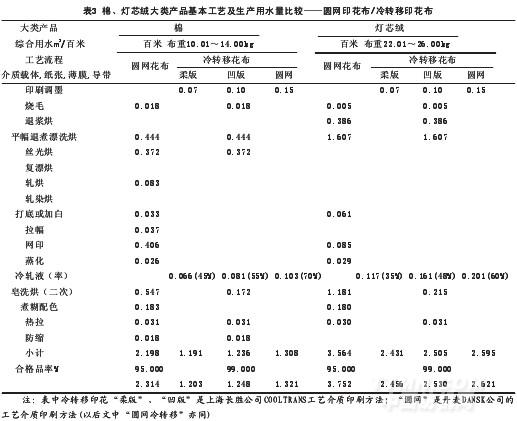 表2中就印花工艺对比,圆网印花工艺的水、电百米消耗量最高,万元产值的水、电消耗量更高,说明其它三种印花产品附加值高。