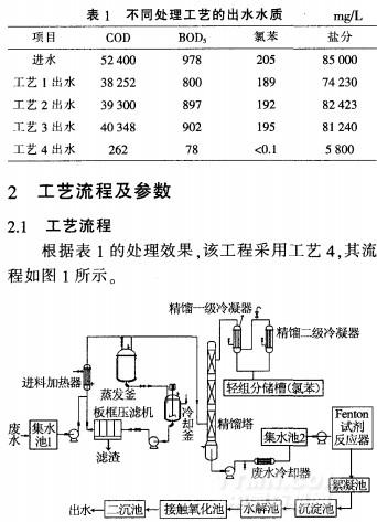 该化工厂废水排放量约为10t/d。COD为52400mg/L左右,氯苯为205mg/L左右,盐分约为85000mg/L,pH约为6。