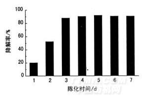 在可见光源强度为21.0 mW/cm2,光照时间为210min的条件下,采用0.5g/L Tm/ TiO2溶胶整理棉织物,探讨溶胶陈化时间对污物降解率的影响,结果如图3所示。