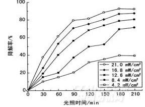 由图4可知,随着光照强度的增加,污物降解率逐渐提高;光源强度为21.0 mW/cm2时,光照180min后污物降解率可达到92%。Tm/ Ti02受光激发产生的电子和空穴浓度会影响污物降解速率。Bahnemann D等[10]研究表明,较低光强下,污物降解速率与光强呈线性关系;中等强度光强下,污物降解速率与光强的平方根呈线性关系。因此,在4.2-21.O mW/cm2的低光强下,污物降解率随光照强度增加而提高。较适宜的光照强度为21.0 mW/cm2。