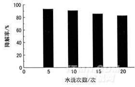 将采用优化工艺制备的Tm/Ti02溶胶(质量浓度0.5g/L,Tm掺杂摩尔分数比2%,陈化5d)用于棉织物整理,通过比较皂洗前后棉织物上污物的降解率,评价负载溶胶织物自清洁功能的耐久性,结果如图5。