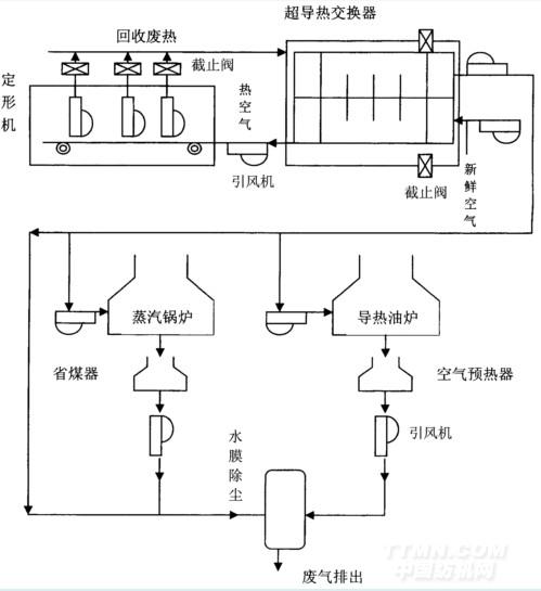 定形机废热→超导热交换机→引风机→导热油炉、蒸汽锅炉(热空气再供定形机)→水膜除尘→废气废热锅炉(油炉)烟囱排出。