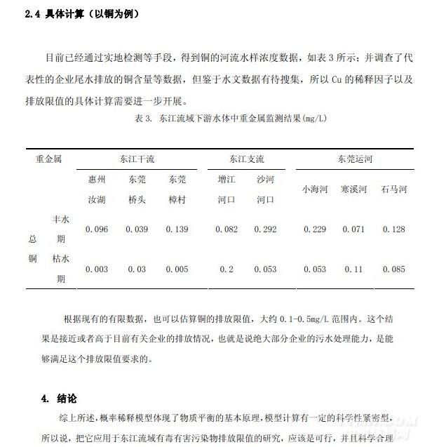 的。但由于水文资料未收集完整,计算仍缺乏足够的基础数据;具体计算和进一步的结果评价将在数据完善后进行。目前估算的铜排放限值,在 0.1-0.5 mg/L 范围内,这是绝大部分企业的污水处理能力能够满足要求的。
