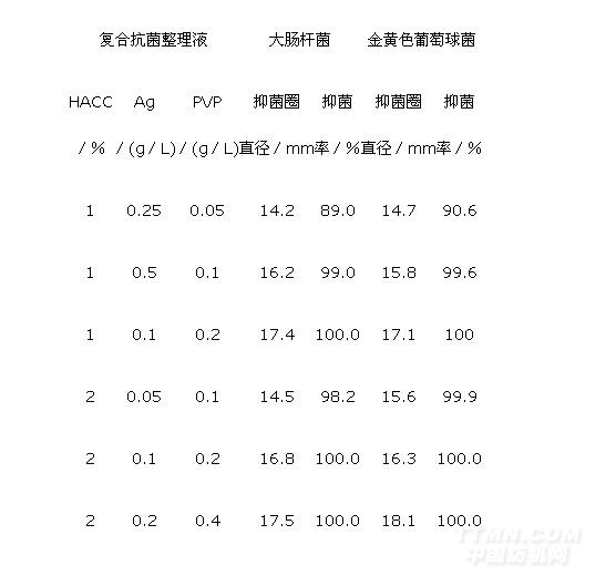预先配制一定浓度的PVP(纳米Ag的高分子分散剂)溶液,置于超声波发生器内,机械搅拌下加入一定质量的纳米Ag及少许106黏合剂(自交联丙烯酸酯型),加去离子水至100mL。超声波分散30min后,得到纳米Ag分散悬浮液。最后加入一定量HACC的水溶液,得到Ag/HACC复合抗菌整理液。
