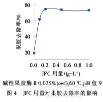 从图4中可以看到,果胶去除率随非离子表面活性剂JFC用量的增大而增大,当JFC用量达到0.2g/L时,碱性果胶酶B对果胶去除率稳定在75%左右,考虑到用量最省,JFC最佳用量为0.2g/L.JFC等非离子表面活性剂对碱性果胶酶B的这种影响,归因于其可提高织物的润湿性和酶在织物上的可移动性,使酶易于解吸及对底物的可及度,有利于酶向催化反应方向移动,从而增加了酶的活性.但当超过它们的临界胶束浓度时,则使酶的活性降低.当不加JFC时,果胶去除率在20%左右.表明酶分子在棉纤维内的扩散对果胶的去除至关重要,如果酸性果胶酶A的分子质量过大,分子扩散受阻,其与底物的接触机会减少,就有可能导致酶活高而果胶去除率很低的结果.