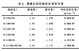 从表2可以看出,几种织物的单位面积失重随拉伸细化羊毛含量的增加而减少,反映出织物的耐磨性能与羊绒含量呈反比关系。