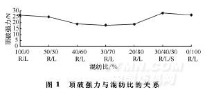 将第2组试样固定在夹布圆环内,弹子按一定速度垂直顶向试样,直至顶破,仪器自动显示顶破强度。每种织物取6块试样,测出各试样的顶破强力,然后取平均值。同时,在本次测试中加入同等规格的纯拉伸细化羊毛(R/L,0/100)织物作为对比试样,为不同混纺比的顶破强力试验提供参照。结果如图1所示。