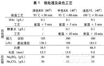 以65%棉/35%竹混纺纱作为原料,直接采用纯棉的工艺加工,对不同纱支、不同颜色进行前处理及染色(表1)。