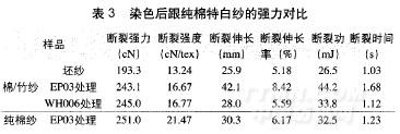 采用两种不同的前处理工艺,染色后跟纯棉特白纱进行强力对比,测试结果见表3。