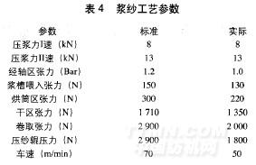 由于竹浆纤维良好的伸长率,棉/竹纱易伸长,但回复性能低,故棉/竹混纺纱浆纱路线基本采用低张力、少伸长的原则,浆纱过程各区张力都比正常工艺降低,主要工艺参数见表4。