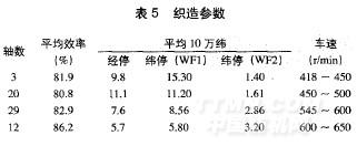 织造工艺应采取合适的温湿度、较小的开口和上机张力。上机工艺为:张力160kg,环境温度26.5℃,环境湿度53.9%,工艺送风关闭。车速设在418~650r/min之间,表现为毛羽稍多,经纱稍有粘连,10万纬经纬停稍多(表5),总体比100%棉纱略差,但生产基本正常。