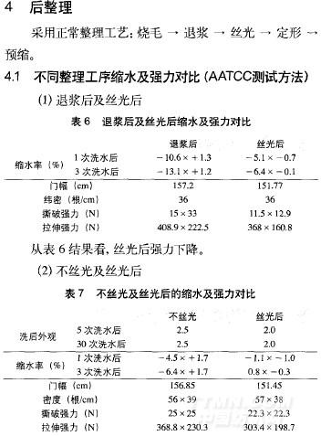 (4)后整理:面料毛羽多,调整烧毛工艺;缩水大,通过碱丝光进行改善;各工序张力宜偏小控制;后整理加色会产生牢度问题,此类品种不适合连续轧染加工。