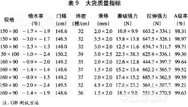 从表9可看出,大货的缩水、滑移、撕破强力及拉伸强力等均能达到较高的物理指标,同时A级率达到平均99-3%。