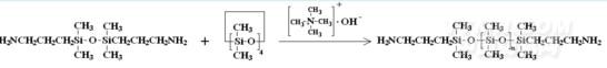 将1,3–二氨丙基–1,1,3,3–四甲基二硅氧烷、八甲基环四硅氧烷、四甲基氢氧化铵投入装有搅拌器、温度计的三口烧瓶中,搅拌升温到95~100°C之间,保温反应7~8h,保温结束后升温到135°C左右,使催化剂受热分解,然后减压抽真空拔除低沸物,得透明、粘稠状的端氨基硅油。反应式如下: