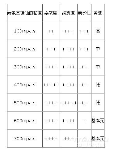 在端氨基硅油的合成过程中,可以通过控制1,3–二氨丙基–1,1,3,3–四甲基二硅氧烷和D4的比例来调整端氨基硅油的粘度,在整个体系中提高1,3–二氨丙基–1,1,3,3–四甲基二硅氧烷的含量,所得端氨基硅油的粘度就比较少,相反粘度就较大。采用不同粘度的端氨基硅油制成新型超柔软滑爽硅油,进行对比(表1)。