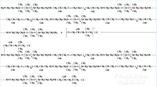 在上述制备好的线性多元嵌段共聚有机硅的基础上,加入适量的阳离子醚化剂,搅拌升温到85~90°C之间,搅拌反应5h左右,冷却降温,即得透明、淡黄色、粘稠状的新型超柔软滑爽硅油。反应式如下: