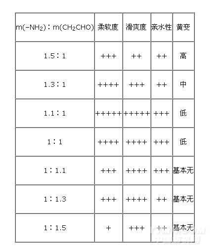 表2m(–NH2)︰m(CH2CHO)对新型超柔软滑爽硅油性能的影响