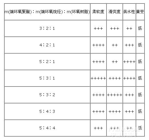 表3 m(端环氧聚醚)︰m(端环氧烷烃)︰m(环氧树脂)对新型超柔软滑爽硅油性能的影响