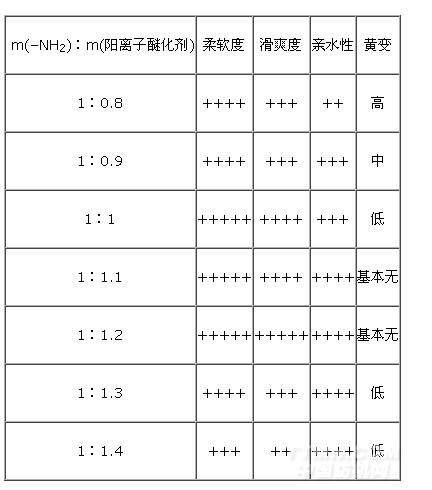 表4m(–NH2)︰m(阳离子醚化剂)对新型超柔软滑爽硅油性能的影响
