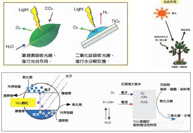 关于光触媒的机理,除了叶绿素“天然的光触媒“,在1960年日本学者发现“二氧化钛(TiO2)经光的照射后,将水(H2O)分解成氢和氧,同时借由二氧化钛表面形成的电子﹝e ¯ ﹞及电洞﹝h ¯ ﹞能针对有机化合物进行分解,并重组H2O及CO2,所以光触媒的机理,是分解作用,整个过程就像是一场有趣的抢电子游戏 ;当吸附一定量的有机物质后,只要再经过光源的照射,光触媒可