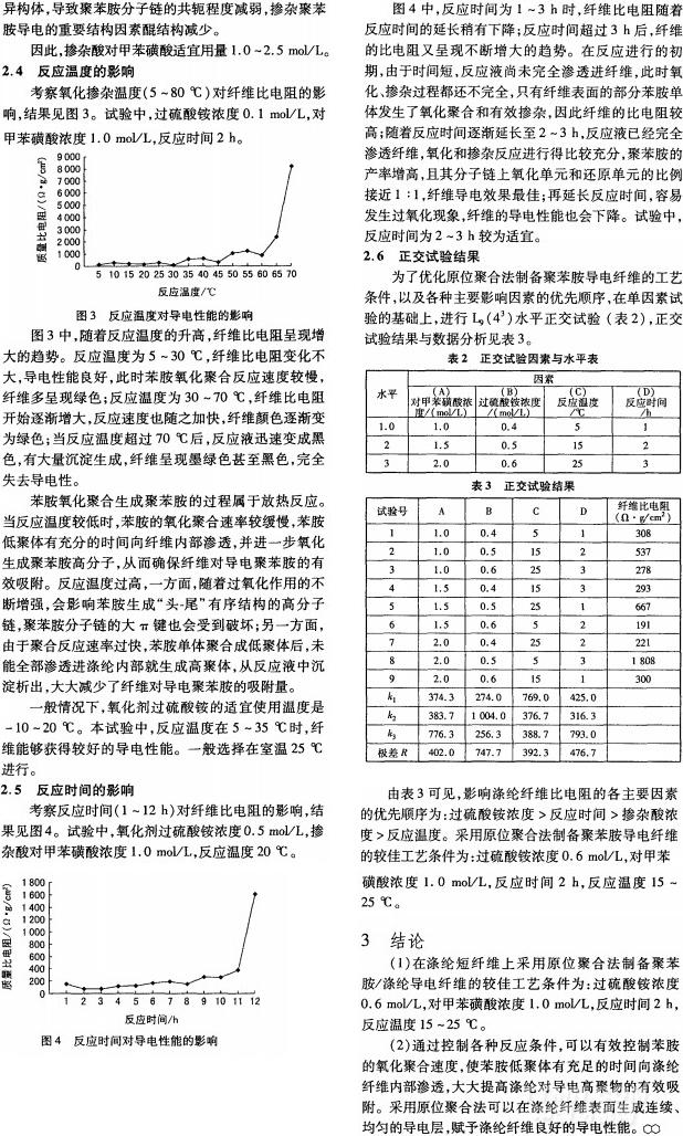 摘 要:采用原位聚合法制备聚苯胺/涤纶复合导电纤维,探讨碱处理、氧化剂和掺杂酸用量、反应温度和反应时间等因素对纤维导电性能的影响。试验结果表明,通过控制反应条件,可使涤纶纤维有效吸附聚苯胺,制备出性能优良的导电纤维。其较佳工艺条件为:过硫酸铵浓度0.6 mol/L,对甲苯磺酸浓度1 mol/L,反应时间2 h,反应温度l5—25℃。
