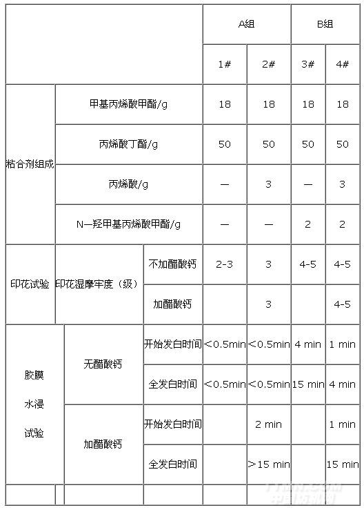 为检验上述机理解释是否正确,特设计‘证伪性实验’如下:对不可交联型、自交链型两类丙烯酸酯粘合剂,分别采取加或不加丙烯酸(含氢键单体)进行对比。试验样分别检测膜的耐水性和涂料印花湿摩擦牢度。其次,在含有丙烯酸单体的粘合剂中,加用醋酸钙,并检测上述指标。