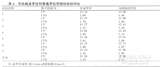 由表中统计数据可看出,无机械波罗拉和普通罗拉相比,其平均值和CVb值均有较大幅度下降,分别下降了0.42个百分点和0.96个百分点。同时,在试验中还发现千米细节、千米粗节、千米棉结等质量指标也均有明显改善,值得大面积推广。