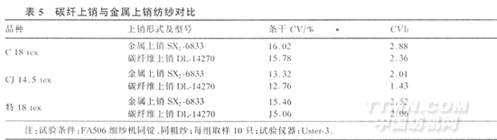 在实际生产中,我们对金属上销和碳纤上销的使用情况进行了对比,发现碳纤维上销相对金属上销而言,其刚度、韧性较好,抗变形能力强,具有优良的自张力功能,胶圈运转稳定,成纱质量稳定;碳纤维上销的成纱质量确实要优于金属上销,其质量对比情况见表5。