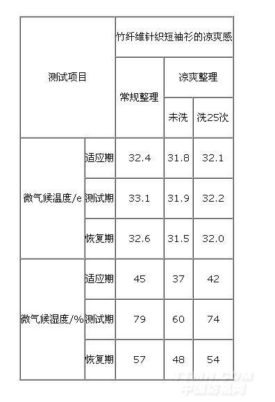 由表1可知,经凉爽整理的竹纤维针织面料,其微气候温度较一般竹纤维针织面料低0.6~1.2e,微气候湿度也显著降低,水洗25次后仍有效。