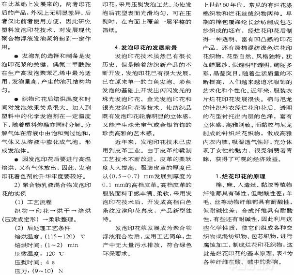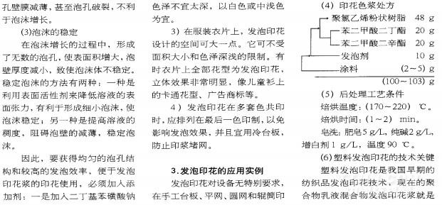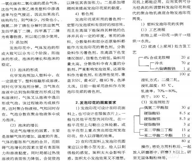 化学发泡剂的种类很多,约有1 ooo~0以上,但适宜于织物发泡印花浆的发泡剂并不多,因为 作为织物发泡印花浆要有一定的 分解温度和发气量。