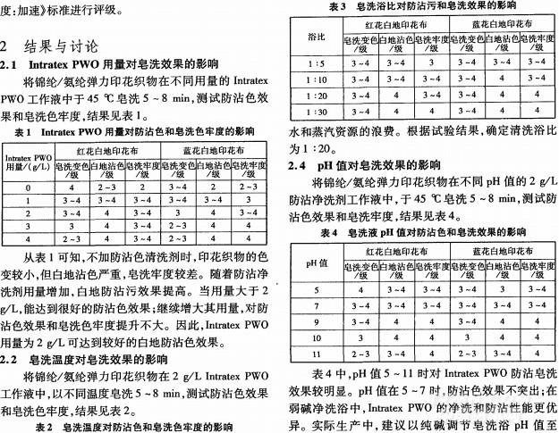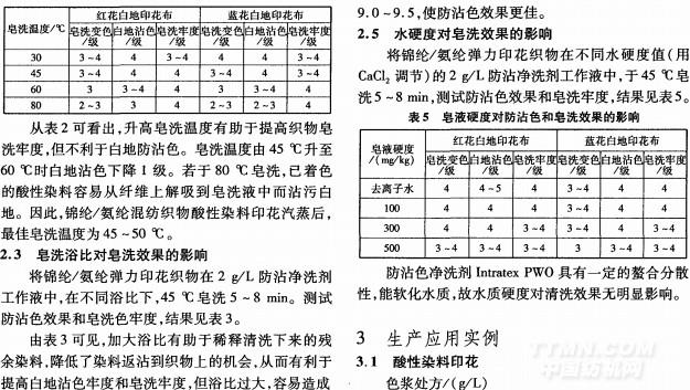 (2)较高温度净洗有助于提高印花织物皂洗牢 度,但不利于白地防沾色。推荐清洗工艺为:首先低温 条件下加Intratex PWO 1—2 g/L,在pH值9.0—9.5 条件下水洗,尽量去除印花面料上的浮色,以有效防止 印花面料的沾色;之后提高水洗温度至45~50℃,加 入酸性防沾色净洗剂Intratex PWO 2—3 g/L进行清 洗,以提升净洗效果与印花织物色牢度。