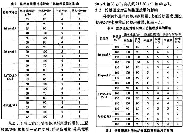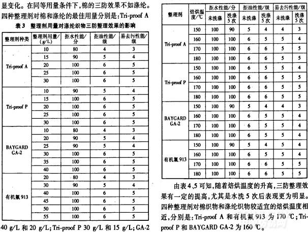 (1)四种整理剂整理棉和涤纶织物的最佳用量分别是:Tri—proofA40g/L和20 g/L;Tri—proofP 30g/L和15g/L;GA-2 50g/L和30 g/L;有机氟913 60g/L和40g/L。